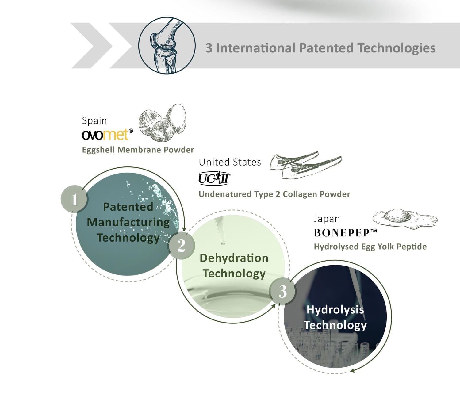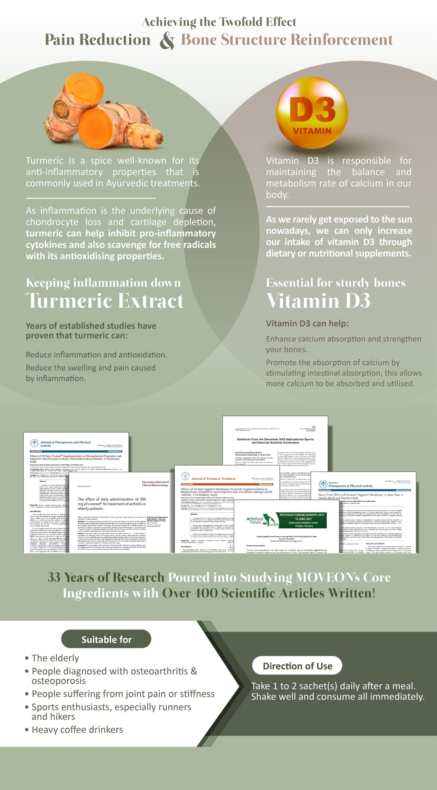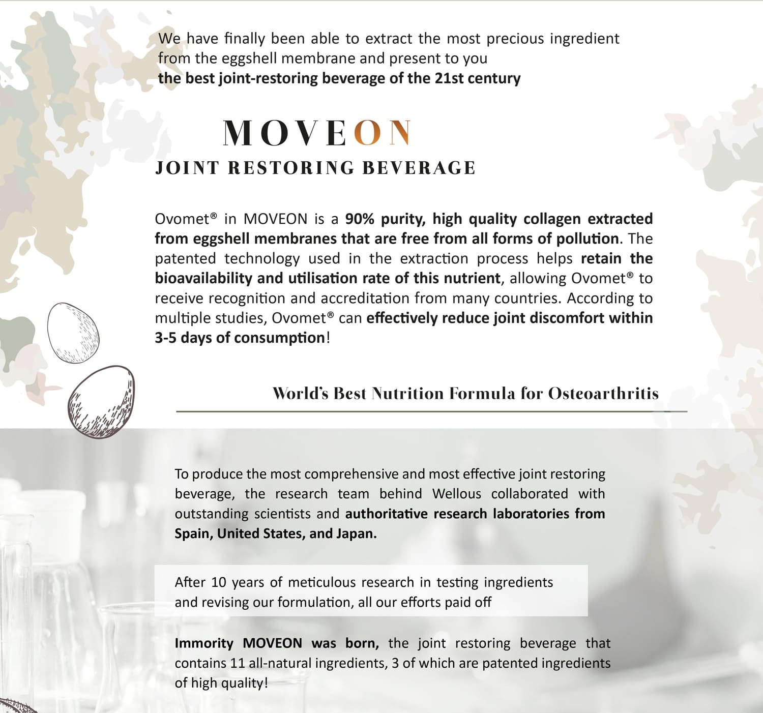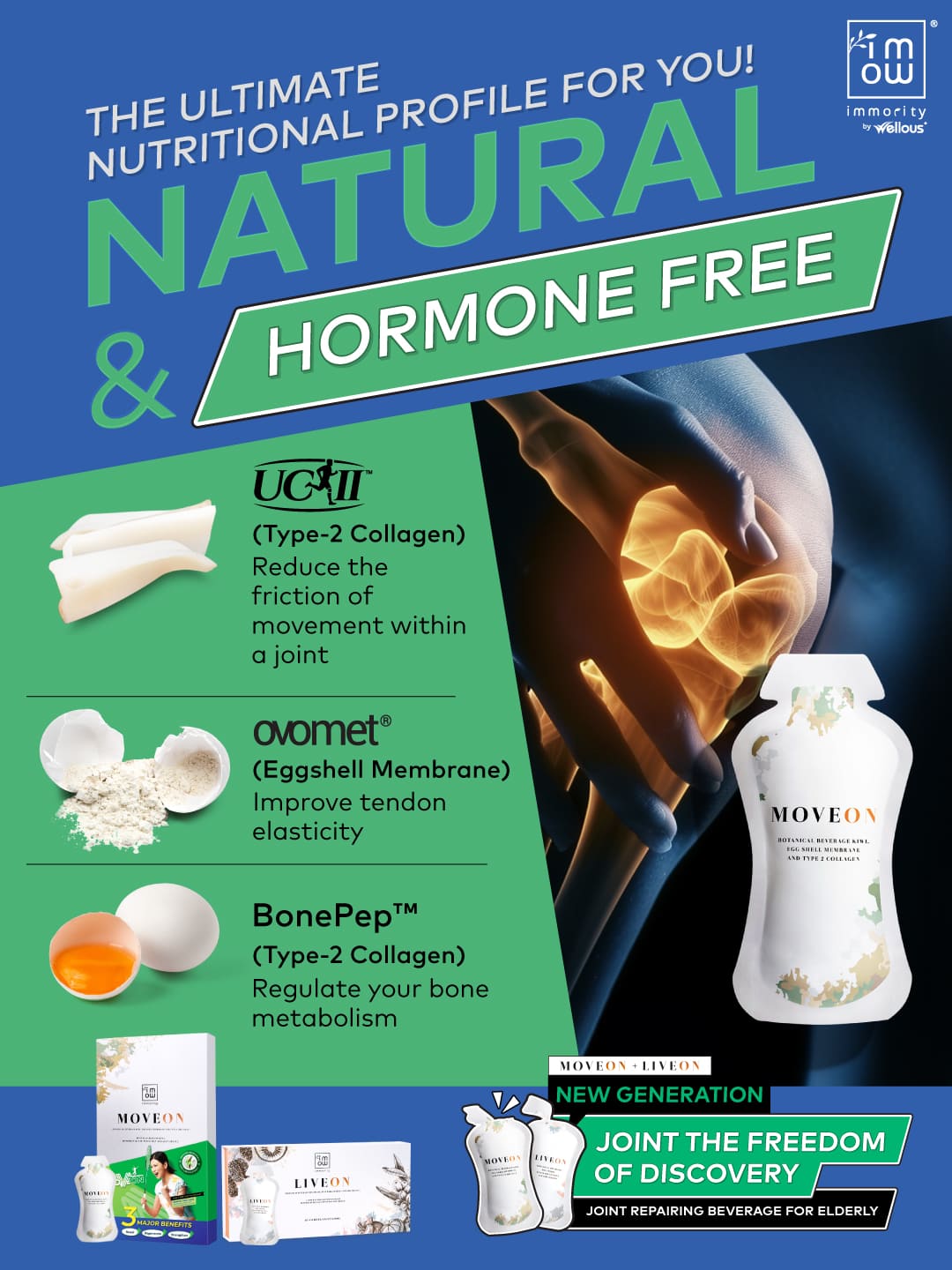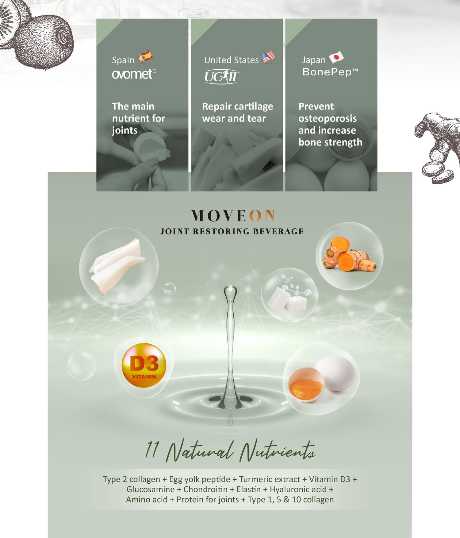 Protecting joints and tackling osteoarthritis, Moveon is powered by Ovomet eggshell membrane powder, founded by Eggnovo S.L, a renowned bio-technology company from Spain, which helps with repairing joint cartilage and synovial fluids.